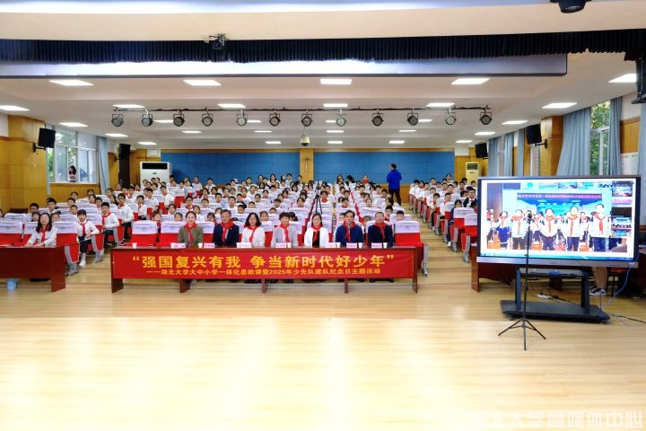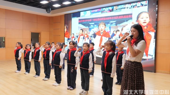 “准备着,为共产主义事业而奋斗!”“时刻准备着!”10月13日,中国少年先锋队建队76周年纪念日当天,湖北大学附属中学礼堂内,宣誓声铿锵有力。与此同时,地处新疆维吾尔自治区第五师双河市的湖北大学附属双河实验学校新队员们通过屏幕同步宣誓,稚嫩却坚定的声音通过网络交织在一起。