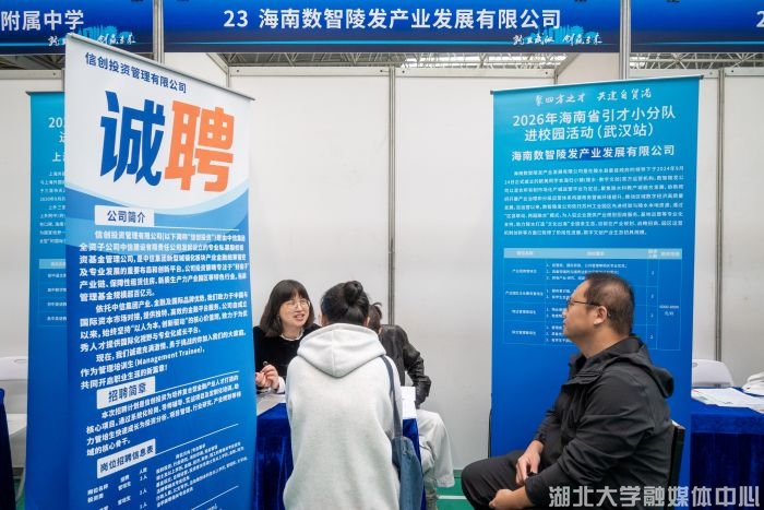 现场不仅有零散分布的企业,更出现了以城市为单位的“引才专区”。“海南省引才小分队”以及天门、潜江、荆门等市的人社部门组团进校,将地区发展概况与人才引进政策进行集中推荐。