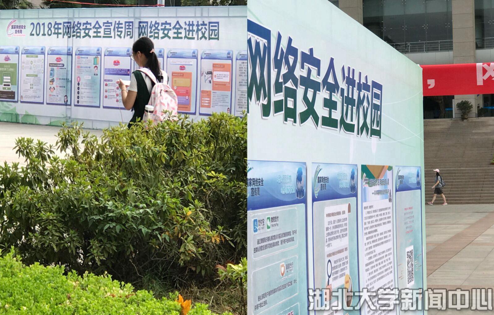 宣传周期间,学校通过线上线下相结合的方式积极推进网络安全进校园宣传教育活动。线上,通过微信门户和官方微博开辟网络安全宣传专栏,连续推出系列图文,以身边的案例、幽默的漫画等生动浅显的形式向师生普及网络安全知识,宣传网络安全法规。线下,一方面在学校标志性建筑及校内人员集中的主干道悬挂相关的宣传标语,另一方面在图书馆求索广场推出网络安全知识图文展,分别从“网络诈骗如何防范”“常见的电信诈骗有哪些”“微信红包注意事项”“网购入坑如何维权”“如何保护个人信息安全”“看懂十大APP整改条例”等六大板块,为师生详细介绍常见的网络安全风险及具体防范措施,吸引了大批师生驻足浏览。
