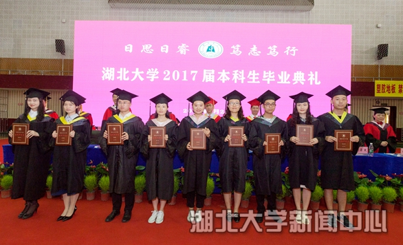 2017年,湖北大学共有4205名本科生获得学位顺利毕业。湖大学风一贯淳朴优良,2017届本科生自入校以来,勤学苦研、奋发有为,取得了很多优异的成绩,涌现出一批品学兼优、全面发展的先进典型,如生命科学学院2013级生物科学专业学生范昱学习成绩优秀,主持1项国家级大学生创新计划,多次荣获国家级、省级奖励,现保送到北京大学硕博连读;计算机与信息工程学院2013级计算机科学与技术专业学生殷晓飞,以本科生第一作者身份公开发表SCI学术论文,主持2项省级大学生创新创业实践项目,现保送至复旦大学深造;外国语学院2013级英语教育专业学生王维国,在全国性专业竞赛中屡获殊荣,并多次在国际合作洽谈会议等场合担任翻译工作,毕业时收到23所海外名校的录取通知书,即将赴英国爱丁堡大学留学深造;政法与公共管理学院2013级法学专业学生龚玉洁,担任校志愿者协会副主席,积极参加“阳光家园”等志愿服务活动,多次荣获全国表彰,毕业之际,她放弃大城市的工作和生活,毅然选择到四川康定农村中学支教,在西部基层奉献青春才华……他们充分展示了我校学生良好的综合素质和精神风貌,为广大学生树立了榜样。