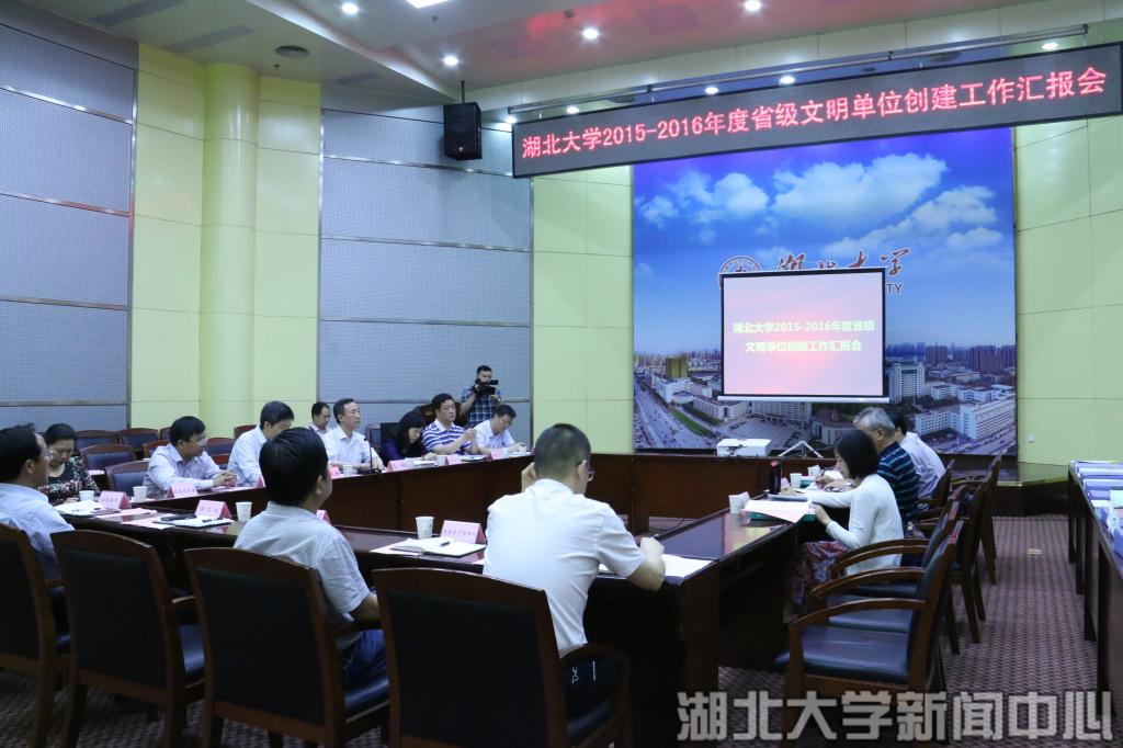5月25日下午,省委高校工委检查组对我校2015-2016年度省级文明单位创建工作进行现场审核,检查组由武汉纺织大学原党委副书记、纪委书记王金华,华中科技大学党委宣传部副部长王学东,武汉轻工大学党委宣传部部长苏维佳组成。校党委书记尚钢、党委副书记刘国新出席汇报会。会议由尚钢主持。