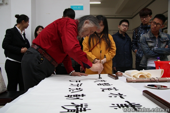 示范笔会群英荟萃、少长咸集,既有德高望重的老艺术家,也有崭露头角的文艺新秀,活动现场气势恢宏,艺术家们现场挥毫泼墨,即兴创作书画作品,受到广大师生热捧。示范笔会公推武汉市书法协会主席黄德琳先生开笔。武汉市书法协会副主席瞿忠谋先生现场点评,为师生介绍各位艺术家作品。艺术家们与师生热情交流,对知行学院艺术系的作品进行了细致点评和积极鼓励。艺术家志愿团还向学院赠送了著名书法家孔可立先生的书法作品和著名篆刻家桂建民先生的篆刻作品。