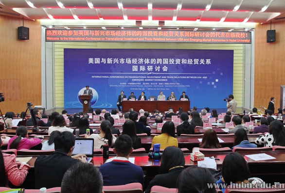 10月30日,由中国美国经济学会主办、湖北大学和加拿大《跨国公司评论》杂志承办的美国与新兴市场经济体的跨国投资和经贸关系国际研讨会在我校开幕,来自巴西、波兰、哥伦比亚等11个国际组织和大学的专家学者,以及武汉大学、南开大学等国内数十所高校的100余名专家学者齐聚湖北大学,参加为期两天的研讨会。我校党委书记刘建凡出席开幕式并致辞。中国美国经济学会副会长、东南大学经济管理学院徐康宁教授出席会议并讲话,加拿大《跨国公司评论》杂志主编江风,国务院发展研究中心对外经济部主任许宏强出席会议并致辞。