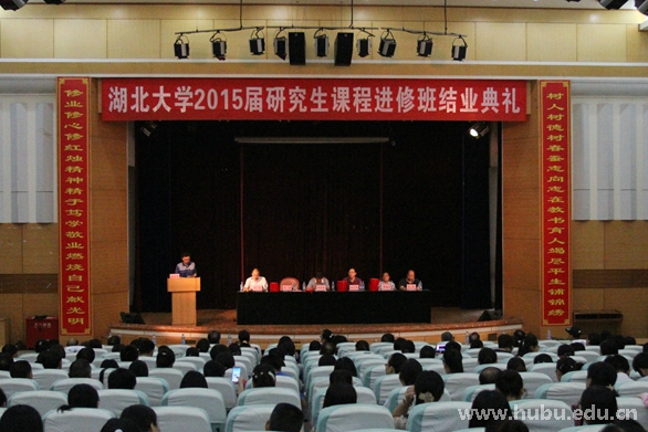 6月28日下午,我校2015届研究生课程进修班举行结业典礼,副校长顾豪爽,武汉市教育局中小学继续教育中心主任施火发,湖北大学老教授协会会长幸海华,研究生院、离退休工作处等相关部门负责人出席典礼并为学员代表颁奖。300多名来自全省的中小学教师参加毕业典礼。