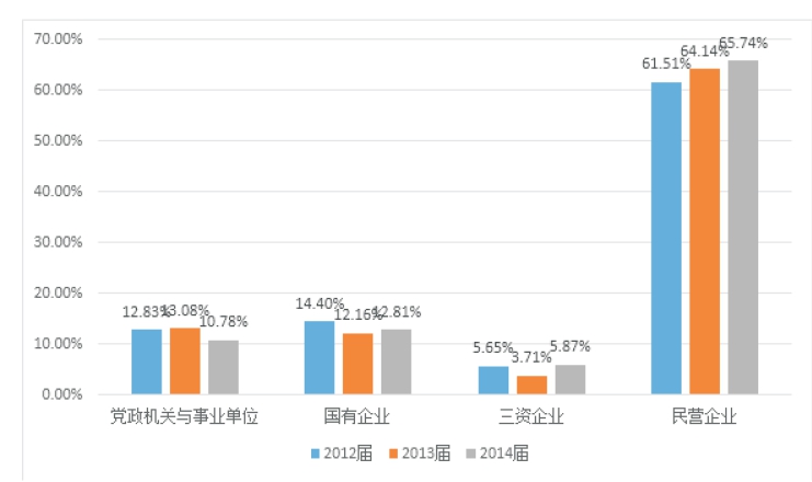 近三年来,毕业生到党政机关、事业单位和国有企业就业的总人数呈下降趋势,民营企业对毕业生的吸纳力和吸引力在增强,2012年开始占比就达到61.51%,并逐年递增。