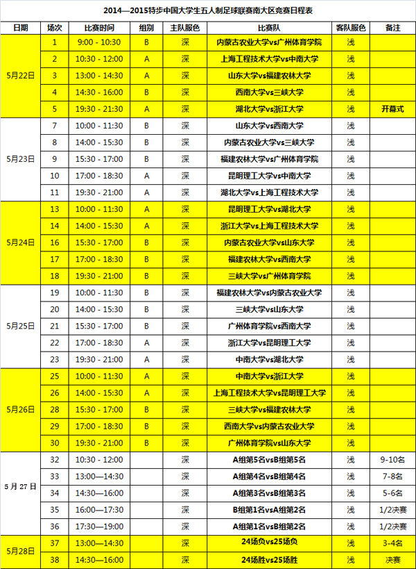 2014——2015“特步”中国大学生五人制足球联赛暨2015年中国大学生足球啦啦队选拔赛南大区赛将于5月22日至28日在我校举行。此次活动由湖北大学承办,旨在贯彻落实《中国足球改革发展总体方案》,推广五人制足球运动,活跃大学生校园足球文化氛围,提高大学生五人制足球运动水平,扩大湖北大学的对外影响,打造学校五人制足球品牌,为中国足球事业发展做贡献。