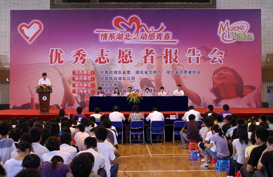 9月24日下午,由团省委、省文明办、省志愿者协会主办的 “情系湖北·动感青春”优秀志愿者报告会启动仪式暨首场报告会在我校2号体育馆隆重举行。省文明办主任蒋南平、团省委副书记张桂华、校党委副书记刘国新、湖北移动公司副总经理陈力出席了仪式,我校近两千名师生参加了当天的活动。