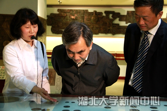 蔡莹(左一)为湖北省委宣传部部长梁伟年(中)讲解我校博物馆珍藏的钱币