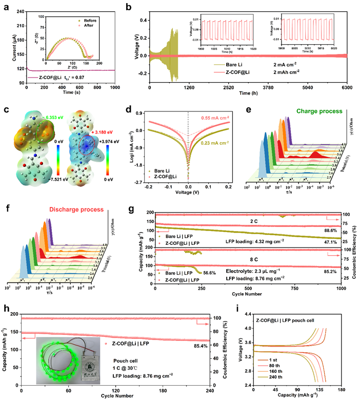 将Z-COF用作功能性界面保护层组装电池时,对称电池显示出超高的锂离子迁移数(0.87)和超长的沉积/剥离循环稳定性(6300 h)。与磷酸铁锂(LFP)正极匹配,在大倍率(8 C)、贫电解液(2.3 μL mg⁻¹)和高负载(8.76 mg cm⁻²)的极端条件下循环1000次后容量保持率仍高达85.2%。组装的Z-COF@Li|LFP软包电池可稳定循环超过240次且无明显电压波动。
