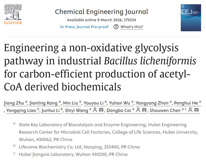 近日,Chemical Engineering Journal在线发表湖北大学生命科学学院陈守文教授课题组题为“Engineering a non-oxidative glycolysis pathway in industrial Bacillus licheniformis for carbon-efficient production of acetyl-CoA derived biochemicals”的研究论文。