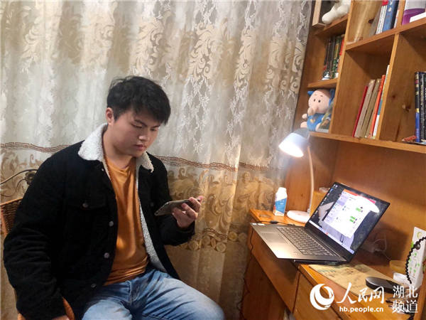 湖北大学新闻学院大二学生袁聆彬在贵州凯里家中收看思政课。(受访者供图)