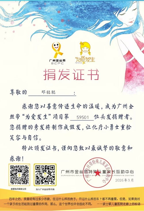 但比起更多人捐发,邓铭聪更希望的是另一种影响——“让更多人开始思考‘我可以用自己的方式去做点什么’。捐发只是一个选择,每个人都可以找到自己的方式。”